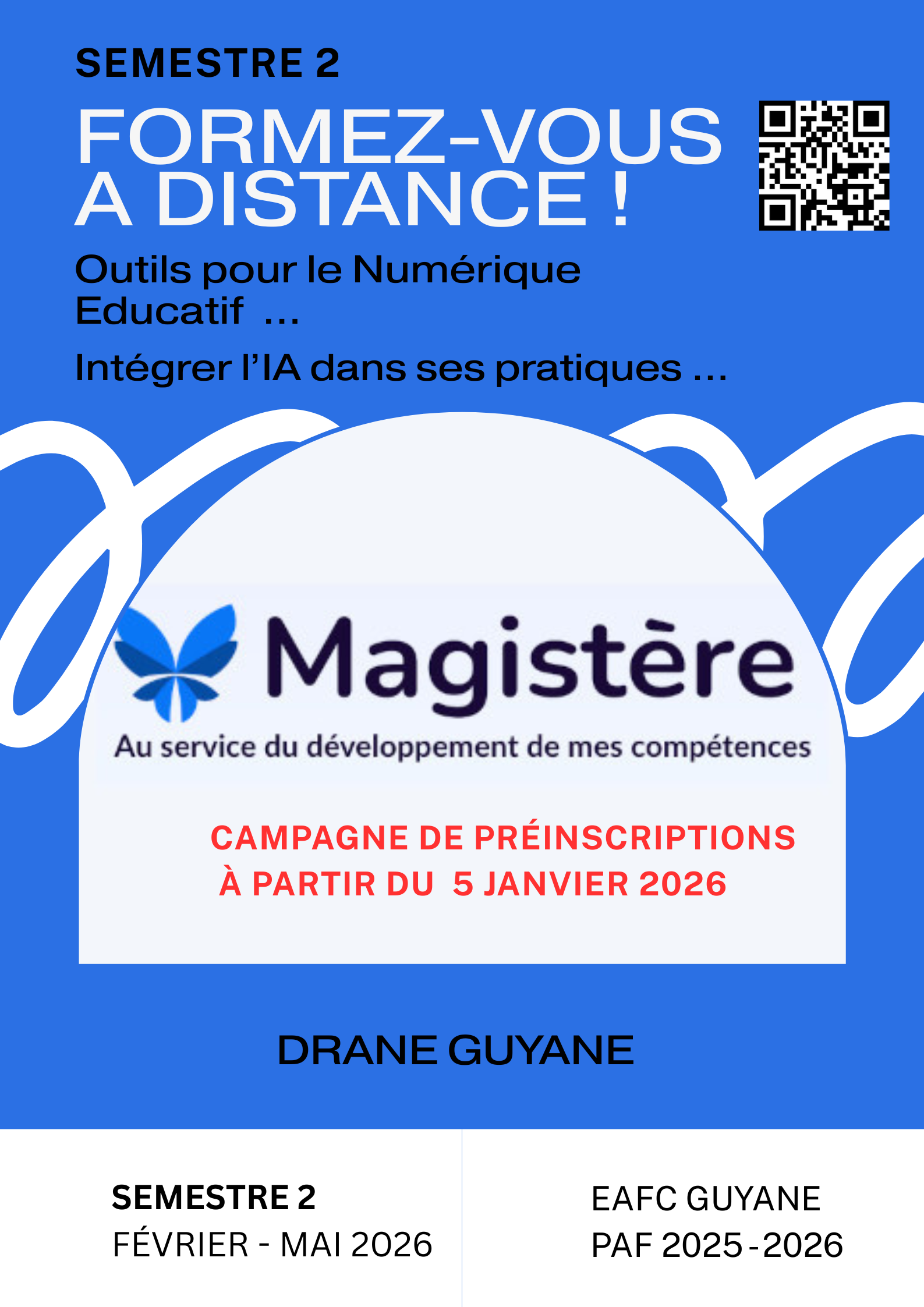 A compter de février 2026 la DRANE Guyane met en œuvre des parcours de formation distanciels hybrides sous magistère pour outiller tous les enseignants de l’académie à une utilisation responsable du numérique éducatif. Ces formations visent les compétences requises pour concevoir des parcours pédagogiques, faire produire les élèves, évaluer les apprentissages et expérimenter de manière individuelle et collaborative avec l’intelligence artificielle. Les nouveaux parcours hybrides intègreront une ou plusieurs sessions synchrones en distanciel avec des temps de travail en asynchrone afin de laisser chaque enseignant avancer à son rythme.